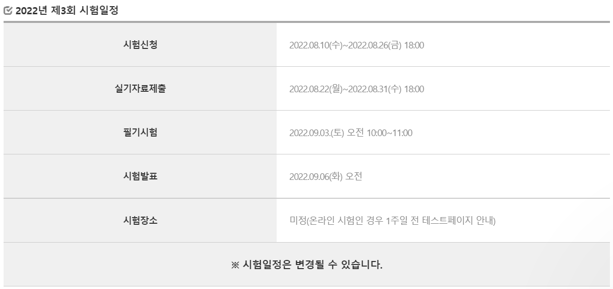¡á ÀÚ°ÝÁ¤º¸ > Á¦3ȸ ÀڰݽÃÇèÀÏÁ¤ ½ÃÇèÀÏ: 2022.09.03(Åä) ½ÃÇè½Åû: 2022.08.10~2022.08.26 ½Ç±âÀÚ·á Á¦Ãâ: 2022.08.22~08.31 Çʱâ½ÃÇè: 2022.09.03.(Åä) ¿ÀÀü