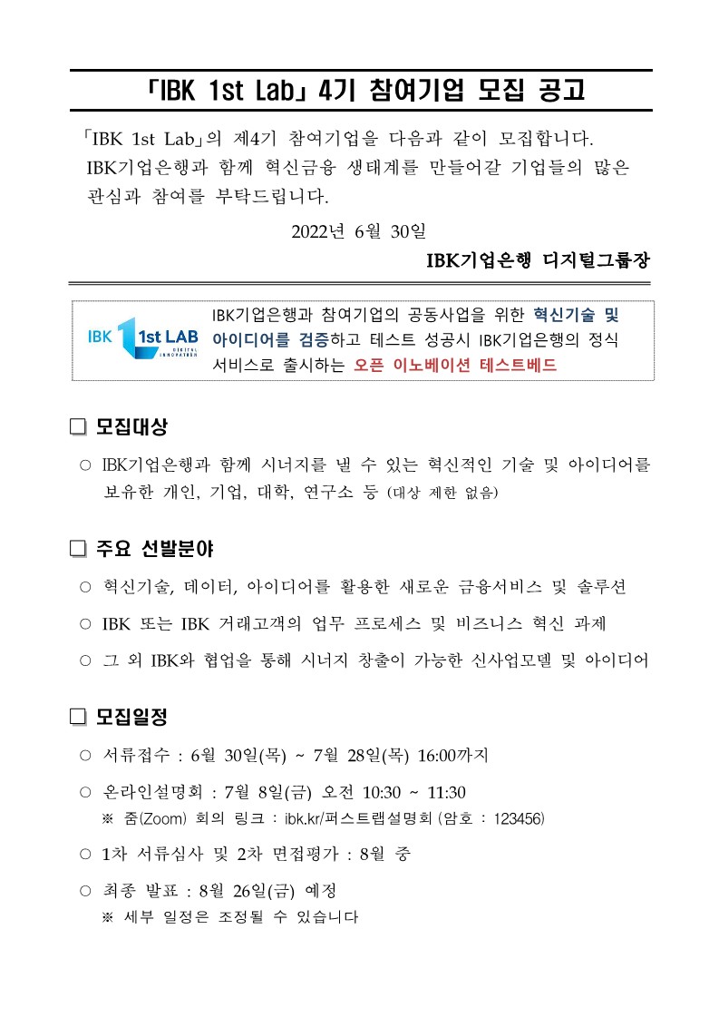 [Çù·Â»çÈ«º¸] IBK 1st Lab 4±â Âü¿©±â¾÷ ¸ðÁý°ø°í